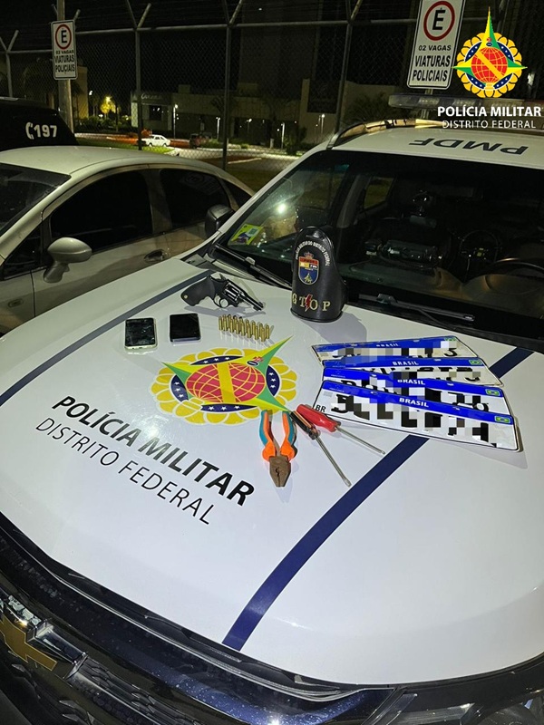 No interior do automóvel também foram apreendidos dois pares de placas automotivas. Após consulta, foi constatado que um dos pares possuía registro de furto, enquanto o outro apresentava indícios de fabricação clandestina. Ferramentas como chave de fenda, chave Phillips e alicate também foram recolhidas.